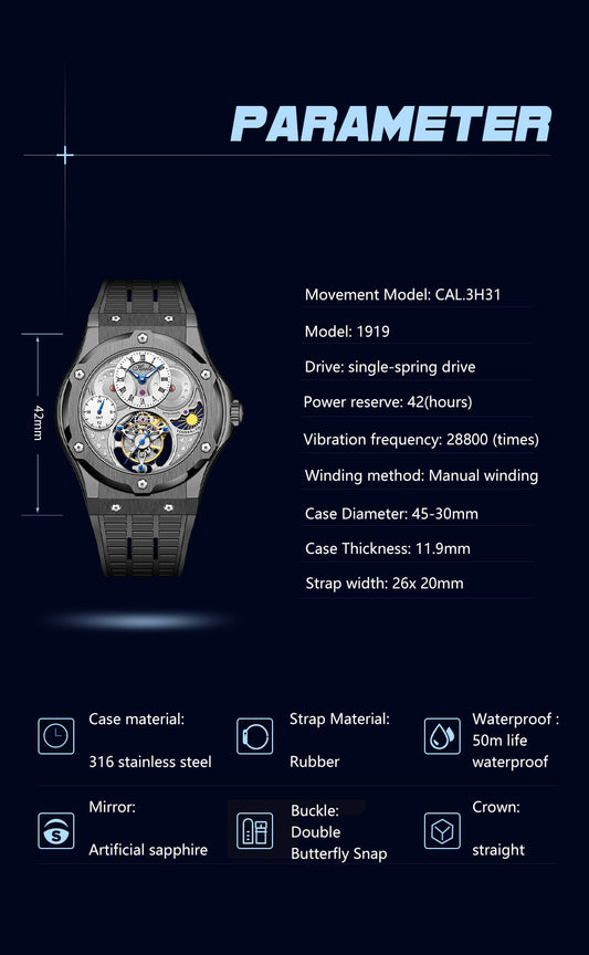 HAOFA Double Barrel Tourbillon 1917 Watch 72 Hours Power Convex Sapphire Mirror